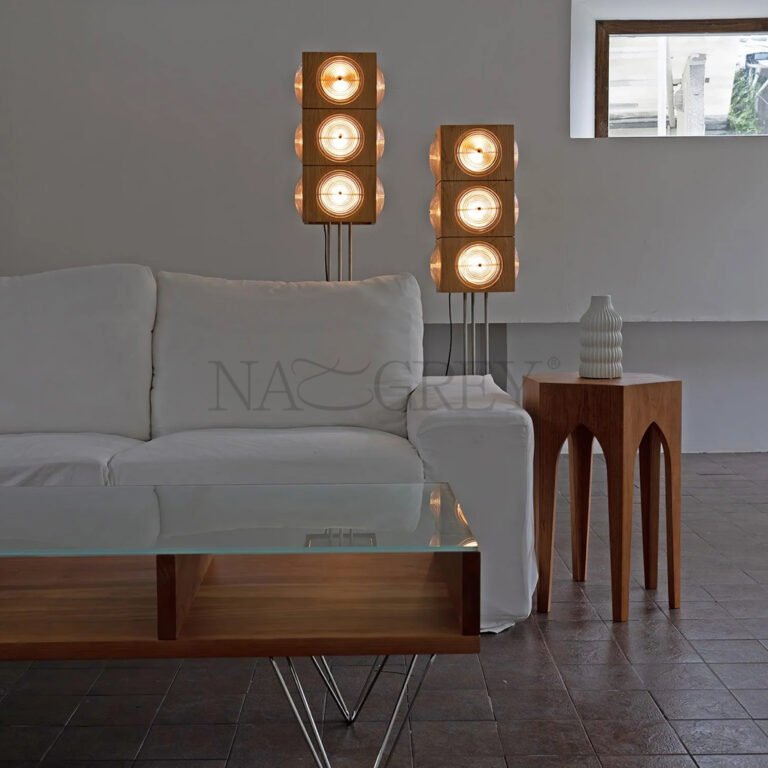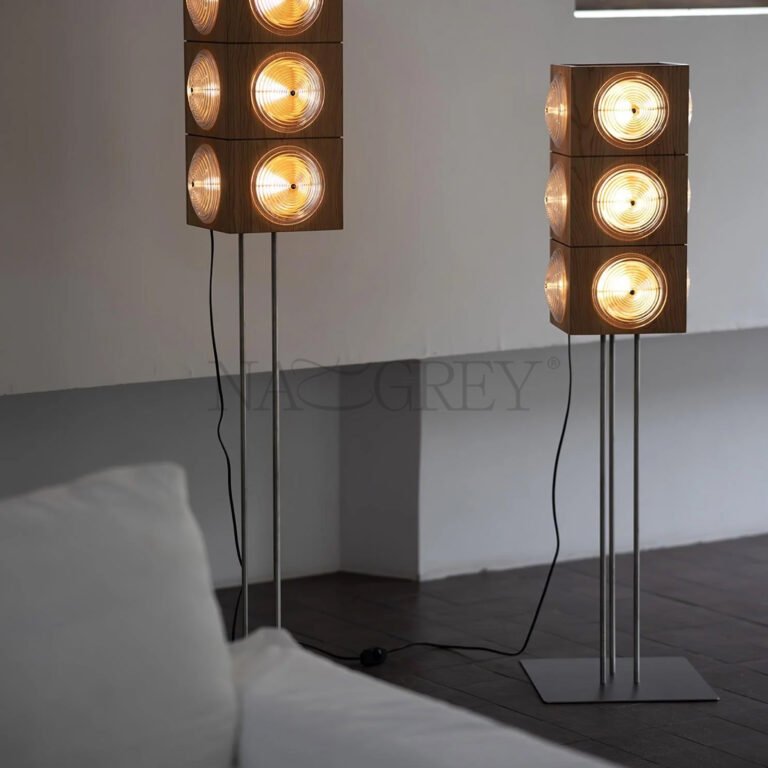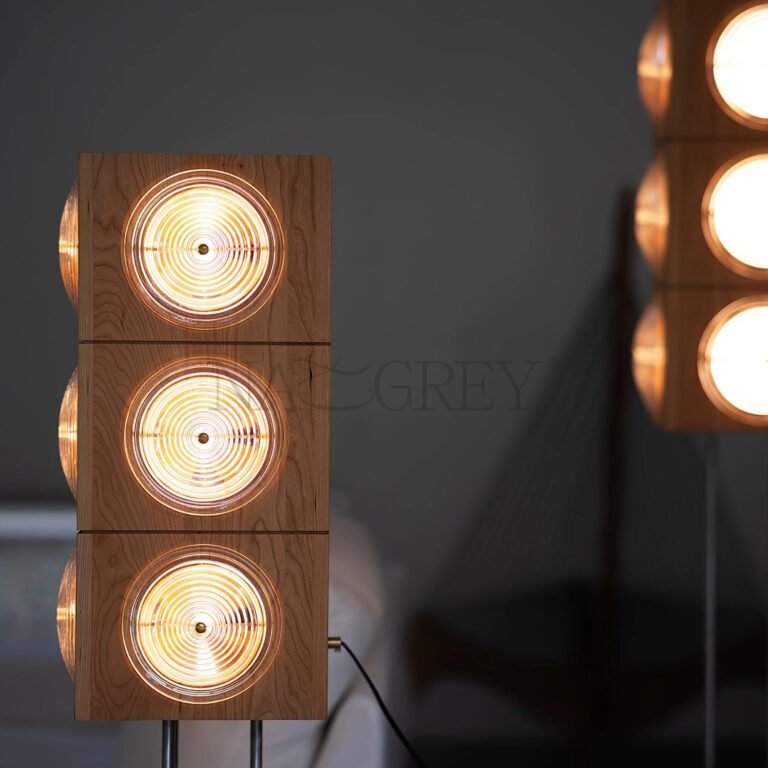 The Radiance Floor Lamp masterfully blends industrial strength with organic warmth, creating a striking presence that commands attention. Its design, reminiscent of a classic speaker, evokes a sense of robust and rational beauty, while the sleek stainless steel tripod base elevates the wooden light box with tall, elegant poise. When illuminated, light softly diffuses through the spherical wavy glass lampshade, casting a warm and subtle glow that highlights the rich texture of the original cherry wood. This harmonious interplay of materials and light results in a uniquely sophisticated mid-century aesthetic, perfect for elevating any living space.